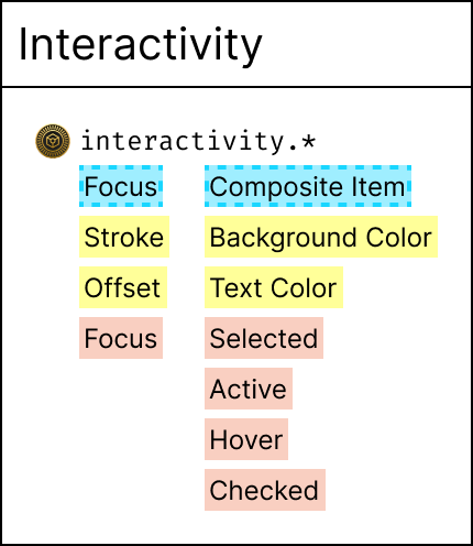 A design token with properties forms the atomic citizen in the model. They can be composed into partials that encode a certain aspect to reason about and meant to be assembled with other tokens or partials to form a particular interface element.